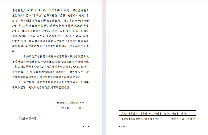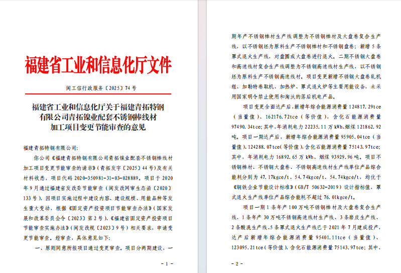 近日,福建省工業和信息化廳發布了《關于福建青拓特鋼有限公司青拓鎳業配套不銹鋼棒線材加工項目變更節能審查的意見》。圖根據文件內容顯示:原則同意所報項目通過變更審查。(來源:福建省工業和信息化廳)聲明:以上內容轉載自51不銹鋼網,如有侵權請告知刪除。